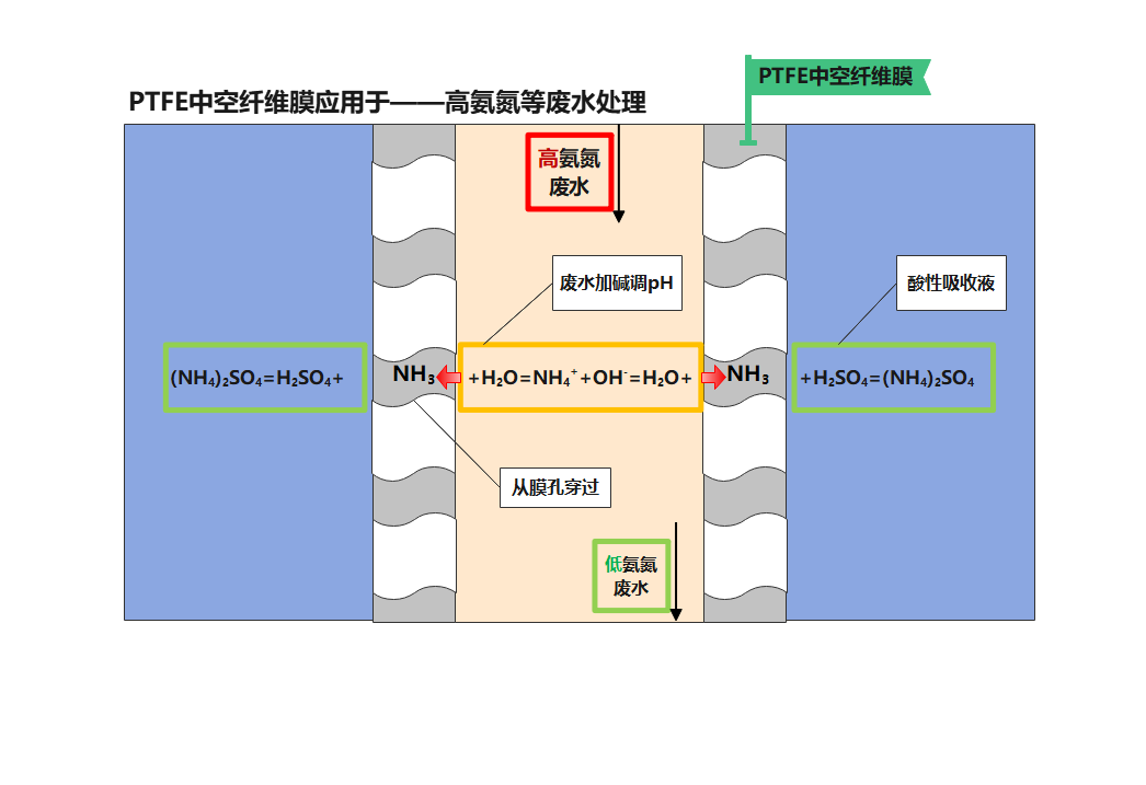 以自主研发、制造的PTFE中空纤维脱氨膜为载体,形成一整套新型、高效、节能、环保的高氨氮废水处理工艺,以解决传统工艺存在的氨氮处理浓度受限、高COD时受限、不节能、占地大、二次污染等问题,具有高效稳定脱氨、可清洗再生等特点,高浓度氨氮废水涉及的行业主要有农药、制药、有色冶炼、垃圾渗滤液、化肥等。